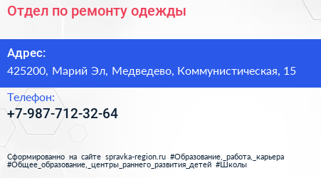 Отдел по ремонту одежды по адресу 425200, Марий Эл, Медведево, Коммунистическая, 15 в дальнейшем Организация, размещена в следующих категориях: