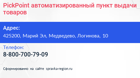 PickPoint, автоматизированный пункт выдачи товаров по адресу 425200, Марий Эл, Медведево, Логинова, 10 в дальнейшем Организация, размещена в следующих категориях: