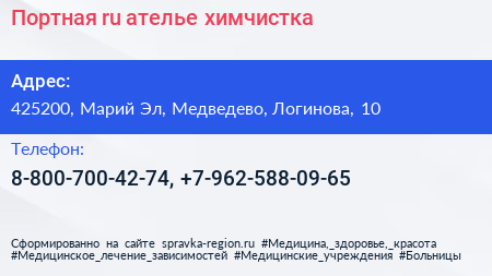 Портная.ru, ателье-химчистка по адресу 425200, Марий Эл, Медведево, Логинова, 10 в дальнейшем Организация, размещена в следующих категориях: