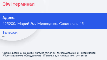Qiwi, терминал по адресу 425200, Марий Эл, Медведево, Советская, 45 в дальнейшем Организация, размещена в следующих категориях: