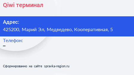 Qiwi, терминал по адресу 425200, Марий Эл, Медведево, Кооперативная, 5 в дальнейшем Организация, размещена в следующих категориях: