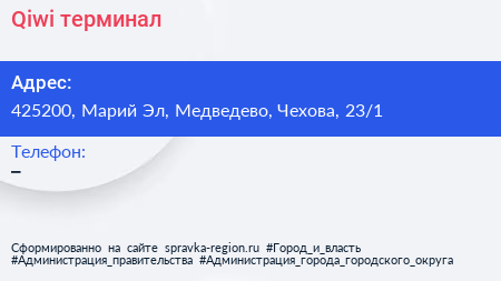Qiwi, терминал по адресу 425200, Марий Эл, Медведево, Чехова, 23/1 в дальнейшем Организация, размещена в следующих категориях: