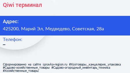 Qiwi, терминал по адресу 425200, Марий Эл, Медведево, Советская, 28а в дальнейшем Организация, размещена в следующих категориях: