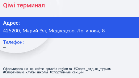 Qiwi, терминал по адресу 425200, Марий Эл, Медведево, Логинова, 8 в дальнейшем Организация, размещена в следующих категориях: