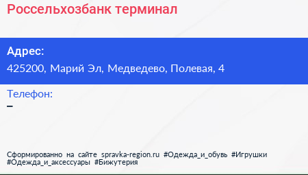 Россельхозбанк, терминал по адресу 425200, Марий Эл, Медведево, Полевая, 4 в дальнейшем Организация, размещена в следующих категориях: