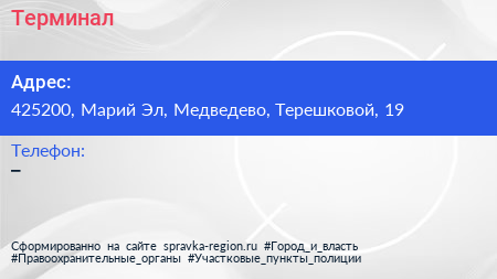 Терминал по адресу 425200, Марий Эл, Медведево, Терешковой, 19 в дальнейшем Организация, размещена в следующих категориях:
