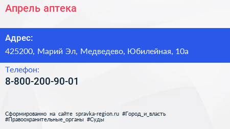 Апрель, аптека по адресу 425200, Марий Эл, Медведево, Юбилейная, 10а в дальнейшем Организация, размещена в следующих категориях: