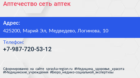 Аптечество, сеть аптек по адресу 425200, Марий Эл, Медведево, Логинова, 10 в дальнейшем Организация, размещена в следующих категориях: