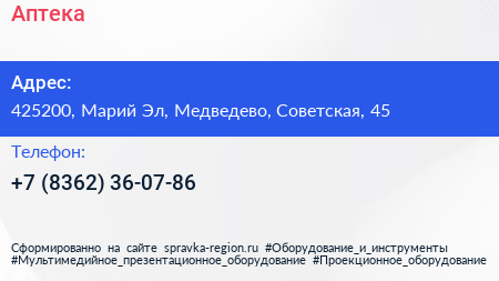 Аптека по адресу 425200, Марий Эл, Медведево, Советская, 45 в дальнейшем Организация, размещена в следующих категориях: