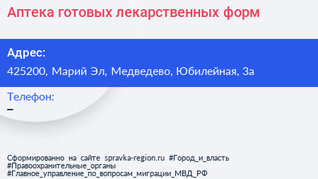 Аптека готовых лекарственных форм по адресу 425200, Марий Эл, Медведево, Юбилейная, 3а в дальнейшем Организация, размещена в следующих категориях: