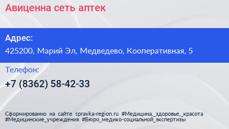 Авиценна, сеть аптек по адресу 425200, Марий Эл, Медведево, Кооперативная, 5 в дальнейшем Организация, размещена в следующих категориях: