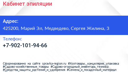Кабинет эпиляции по адресу 425200, Марий Эл, Медведево, Сергея Жилина, 3 в дальнейшем Организация, размещена в следующих категориях: