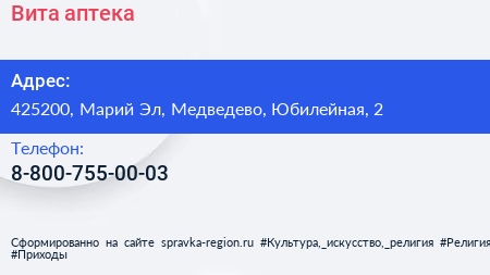 Вита, аптека по адресу 425200, Марий Эл, Медведево, Юбилейная, 2 в дальнейшем Организация, размещена в следующих категориях: