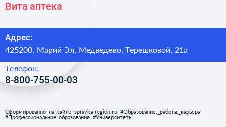 Вита, аптека по адресу 425200, Марий Эл, Медведево, Терешковой, 21а в дальнейшем Организация, размещена в следующих категориях: