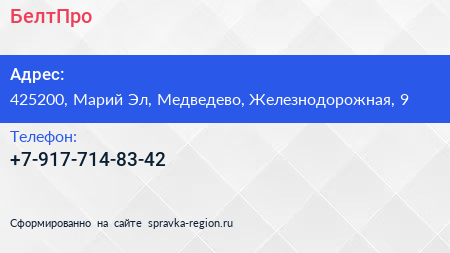 БелтПро по адресу 425200, Марий Эл, Медведево, Железнодорожная, 9 в дальнейшем Организация, размещена в следующих категориях: