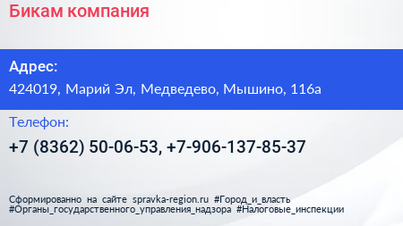 Бикам, компания по адресу 424019, Марий Эл, Медведево, Мышино, 116а в дальнейшем Организация, размещена в следующих категориях: