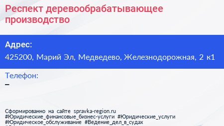 Респект, деревообрабатывающее производство по адресу 425200, Марий Эл, Медведево, Железнодорожная, 2 к1 в дальнейшем Организация, размещена в следующих категориях: