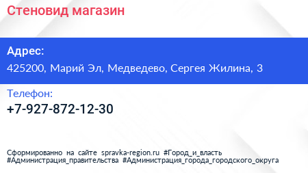 Стеновид, магазин по адресу 425200, Марий Эл, Медведево, Сергея Жилина, 3 в дальнейшем Организация, размещена в следующих категориях: