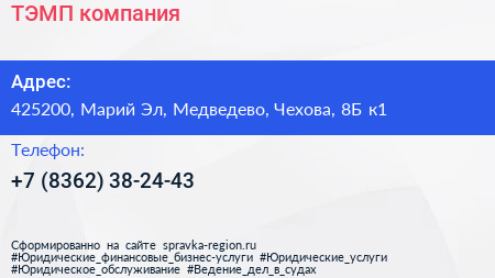 ТЭМП, компания по адресу 425200, Марий Эл, Медведево, Чехова, 8Б к1 в дальнейшем Организация, размещена в следующих категориях: