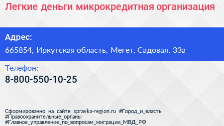 Легкие деньги, микрокредитная организация по адресу 665854, Иркутская область, Мегет, Садовая, 33а в дальнейшем Организация, размещена в следующих категориях: