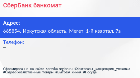 СберБанк, банкомат по адресу 665854, Иркутская область, Мегет, 1-й квартал, 7а в дальнейшем Организация, размещена в следующих категориях: