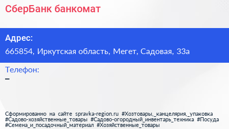 СберБанк, банкомат по адресу 665854, Иркутская область, Мегет, Садовая, 33а в дальнейшем Организация, размещена в следующих категориях: