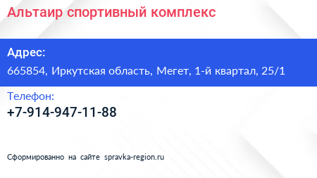 Альтаир, спортивный комплекс по адресу 665854, Иркутская область, Мегет, 1-й квартал, 25/1 в дальнейшем Организация, размещена в следующих категориях: