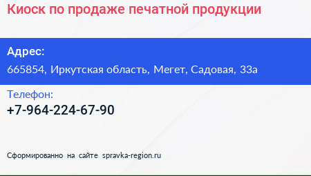 Киоск по продаже печатной продукции по адресу 665854, Иркутская область, Мегет, Садовая, 33а в дальнейшем Организация, размещена в следующих категориях:
