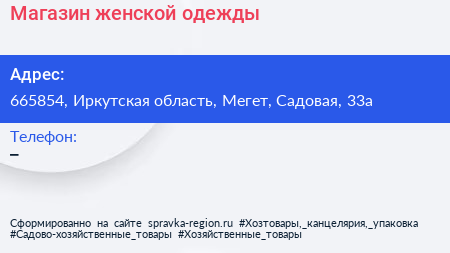 Магазин женской одежды по адресу 665854, Иркутская область, Мегет, Садовая, 33а в дальнейшем Организация, размещена в следующих категориях: