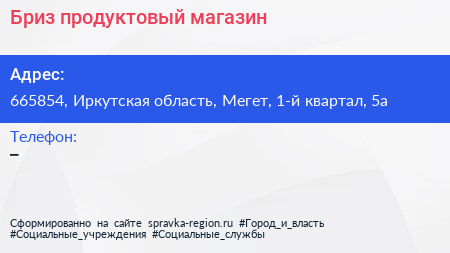 Бриз, продуктовый магазин по адресу 665854, Иркутская область, Мегет, 1-й квартал, 5а в дальнейшем Организация, размещена в следующих категориях: