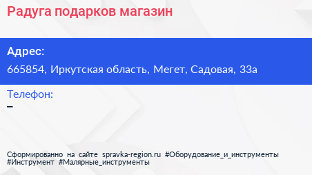 Радуга подарков, магазин по адресу 665854, Иркутская область, Мегет, Садовая, 33а в дальнейшем Организация, размещена в следующих категориях: