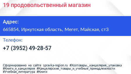 №19, продовольственный магазин по адресу 665854, Иркутская область, Мегет, Майская, ст3 в дальнейшем Организация, размещена в следующих категориях: