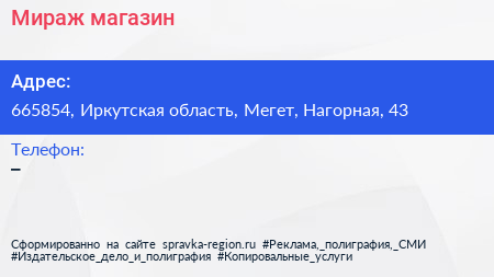 Мираж, магазин по адресу 665854, Иркутская область, Мегет, Нагорная, 43 в дальнейшем Организация, размещена в следующих категориях: