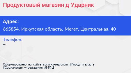 Продуктовый магазин, д. Ударник по адресу 665854, Иркутская область, Мегет, Центральная, 40 в дальнейшем Организация, размещена в следующих категориях: