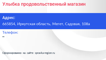 Улыбка, продовольственный магазин по адресу 665854, Иркутская область, Мегет, Садовая, 108а в дальнейшем Организация, размещена в следующих категориях: