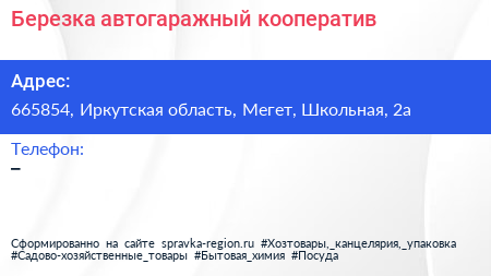 Березка, автогаражный кооператив по адресу 665854, Иркутская область, Мегет, Школьная, 2а в дальнейшем Организация, размещена в следующих категориях: