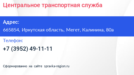 Центральное, транспортная служба по адресу 665854, Иркутская область, Мегет, Калинина, 80а в дальнейшем Организация, размещена в следующих категориях: