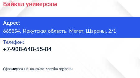 Байкал, универсам по адресу 665854, Иркутская область, Мегет, Шароны, 2/1 в дальнейшем Организация, размещена в следующих категориях: