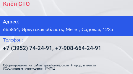 Клён, СТО по адресу 665854, Иркутская область, Мегет, Садовая, 122а в дальнейшем Организация, размещена в следующих категориях: