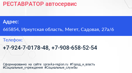 РЕСТАВРАТОР, автосервис по адресу 665854, Иркутская область, Мегет, Садовая, 27а/6 в дальнейшем Организация, размещена в следующих категориях: