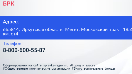 БРК по адресу 665814, Иркутская область, Мегет, Московский тракт 1855 км, ст4 в дальнейшем Организация, размещена в следующих категориях: