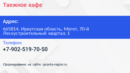 Таежное, кафе по адресу 665814, Иркутская область, Мегет, 70-й Лесоустроительный квартал, 1 в дальнейшем Организация, размещена в следующих категориях: