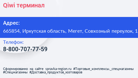 Qiwi, терминал по адресу 665854, Иркутская область, Мегет, Совхозный переулок, 1а в дальнейшем Организация, размещена в следующих категориях: