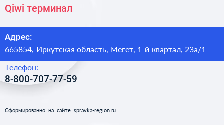 Qiwi, терминал по адресу 665854, Иркутская область, Мегет, 1-й квартал, 23а/1 в дальнейшем Организация, размещена в следующих категориях: