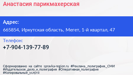 Анастасия, парикмахерская по адресу 665854, Иркутская область, Мегет, 1-й квартал, 47 в дальнейшем Организация, размещена в следующих категориях: