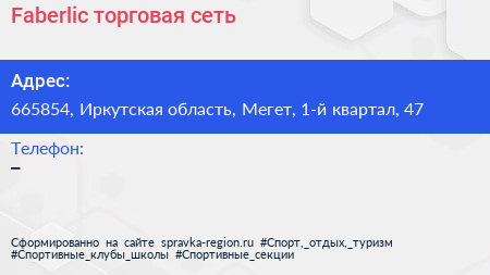 Faberlic, торговая сеть по адресу 665854, Иркутская область, Мегет, 1-й квартал, 47 в дальнейшем Организация, размещена в следующих категориях: