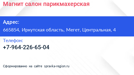 Магнит, салон-парикмахерская по адресу 665854, Иркутская область, Мегет, Центральная, 4 в дальнейшем Организация, размещена в следующих категориях: