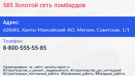 585*Золотой, сеть ломбардов по адресу 628681, Ханты-Мансийский АО, Мегион, Советская, 1/1 в дальнейшем Организация, размещена в следующих категориях: