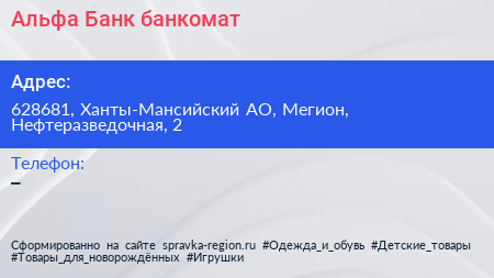 Альфа-Банк, банкомат по адресу 628681, Ханты-Мансийский АО, Мегион, Нефтеразведочная, 2 в дальнейшем Организация, размещена в следующих категориях: