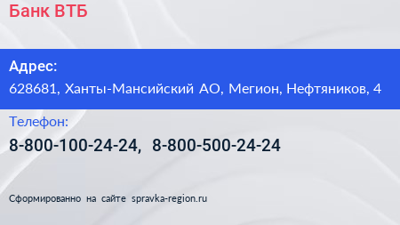 Банк ВТБ по адресу 628681, Ханты-Мансийский АО, Мегион, Нефтяников, 4 в дальнейшем Организация, размещена в следующих категориях: